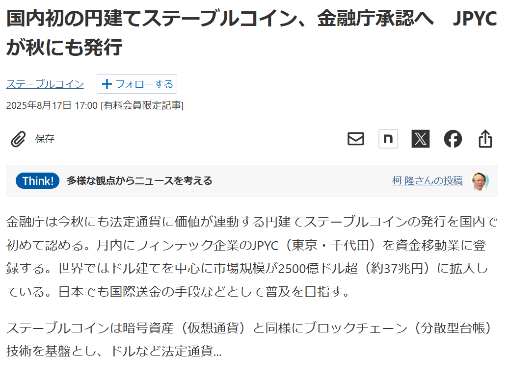 - 1 円ステーブルコインの「JPYC」が金融庁承認