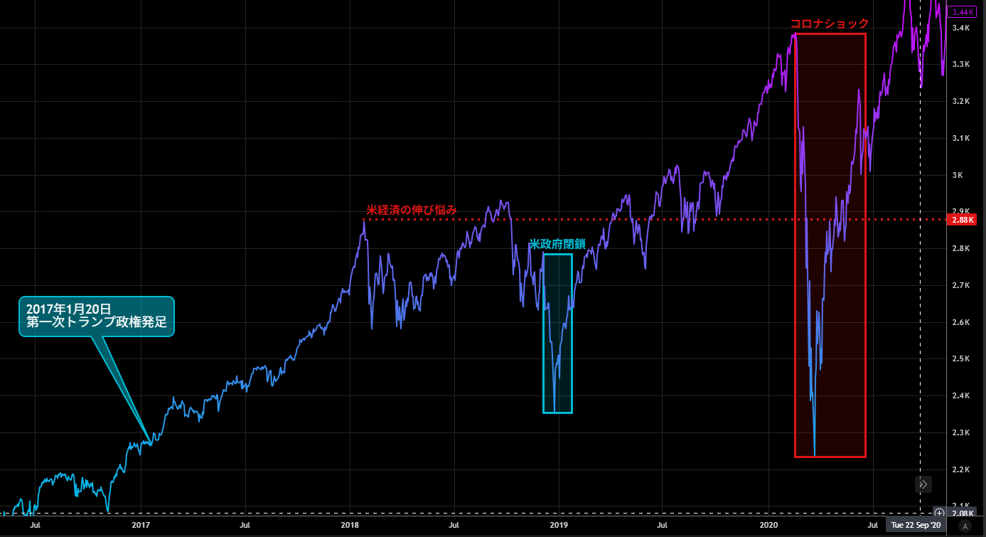 この時米国はリセッション懸念が2018年後半からでており、そこにドナルド・トランプ大統領の予算合意が叶わず、米政府閉鎖期間にS&P500は下記チャートのように大幅な下落となったのです。