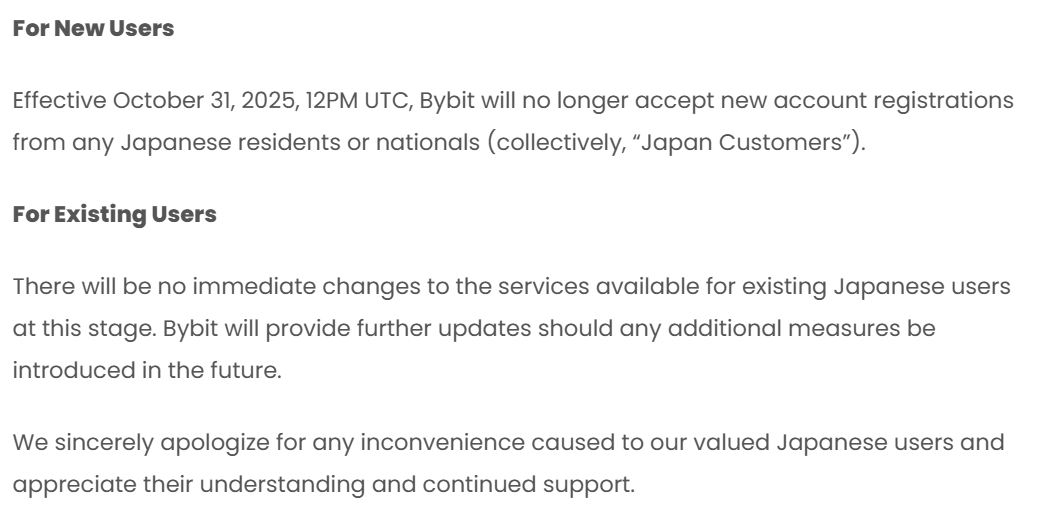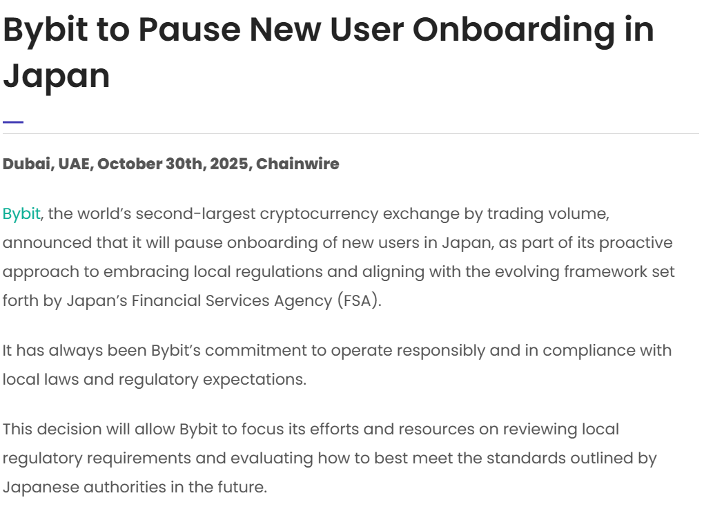 ByBit日本ユーザーの登録停止:https://chainwire.org/2025/10/30/bybit-to-pause-new-user-onboarding-in-japan