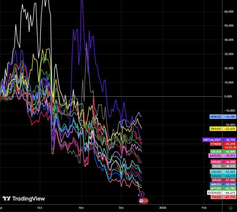 また特に伸びが良かったEigenLayerのEIGENもこの下落煽りを耐えることができず、TIAレベルの-64.21%の下落となっており、イーサリアムのスケーリングのメインとなるArbitrumのARBやOptimismのOPも見る影がないレベルとなっているのです。