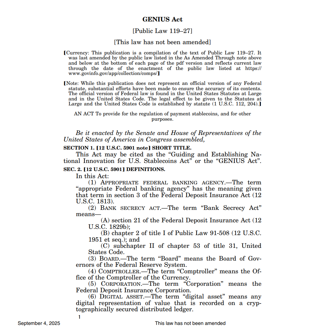 ジーニアス(GENIUS Act)法とは「The Guiding and Establishing National Innovation for U.S. Stablecoins Act」の略であり、米国においてUSDTやUSDCのようなステーブルコイン(Stablecoin)を規制する法律を指す。