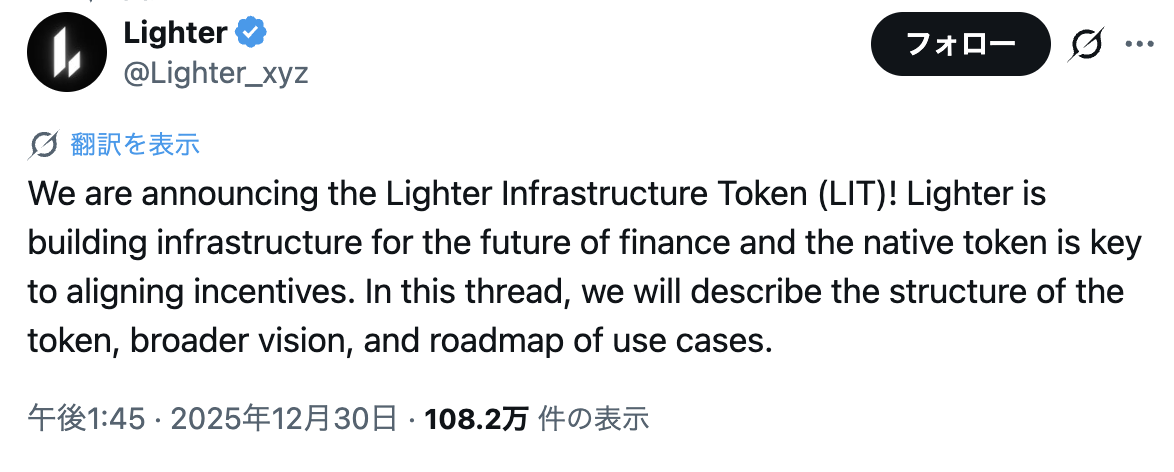 LighterのTGE発表:https://x.com/Lighter_xyz/status/2005862682608472263