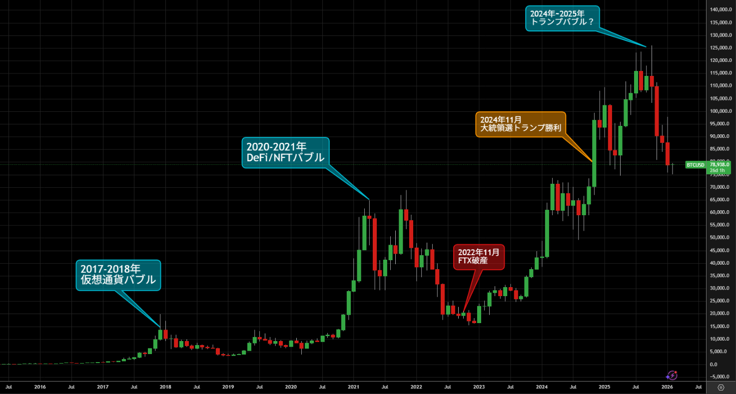 ビットコイン価格は現在ドナルド・トランプ大統領が勝利した2024年11月の高騰を帳消しにする下落となっており、下手をするとトランプバブルとして崩壊してしまう可能性が浮上している状態です。